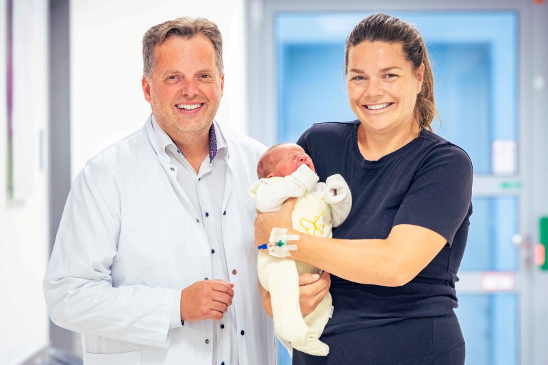 Prof. Dr. Sven Schiermeier (links), Direktor des Zentrum für Frauenheilkunde und Geburtshilfe der St. Elisabeth Gruppe und Chefarzt der Frauenklinik und Geburtshilfe des Marien Hospital Witten, freut sich gemeinsam mit allen Eltern über das neue Familienglück und das Vertrauen in die Klinik.