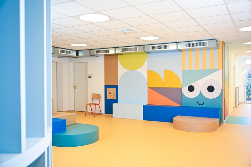Durch den bewussten Einsatz von Farben, Licht und Materialien entstand eine harmonische Umgebung, die Sicherheit vermittelt und Ängste abbaut. Ein besonderer Schwerpunkt liegt auf dem neu eingerichteten, barrierefreien Raum für die videogestützte Gang- und Bewegungsanalyse, der auch Kindern mit schweren körperlichen Einschränkungen uneingeschränkt zugänglich ist.